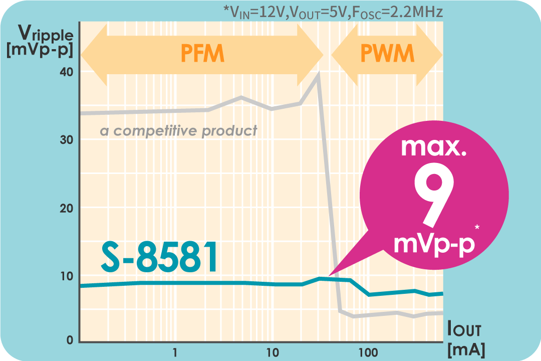 It achieves 9mVp-p across the full load current range including even during PFM control, which is especially prone to ripple.